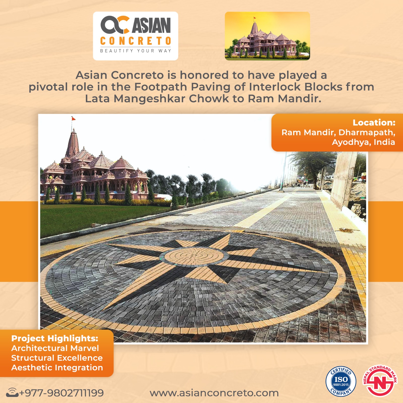 In general, Asian Concreto was chosen for this enormous project for a reason—it was the best chance, not a coincidence. This historic effort was made possible by their ability to integrate quality and aesthetics in a cohesive manner and by their proven track record of delivering excellence in every concrete contract. Asian Concreto’s long-lasting tradition, excellent craftsmanship, and artistic vision come together beautifully in the Ram Mandir’s flooring.